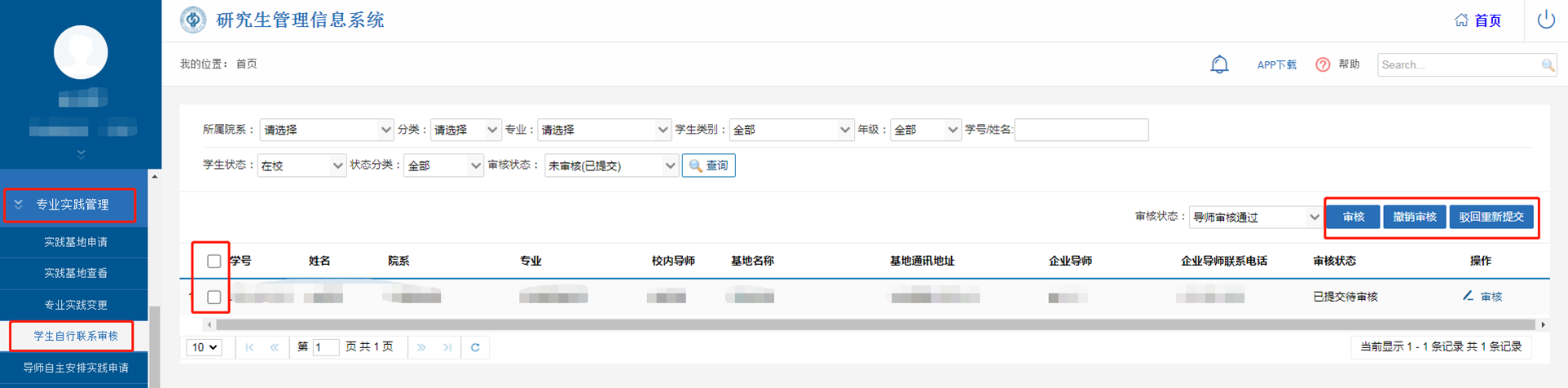 学校导师在【专业实践管理】-【学生自行联系审核】中勾选、审核;