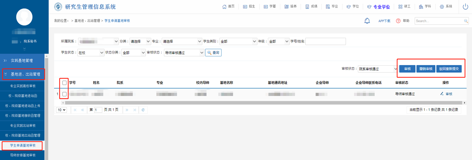 ①在【专业学位】-【基地进出站管理】-【学生申请基地审核】中勾选、审核;审核通过后,系统自动生成企业导师账号;