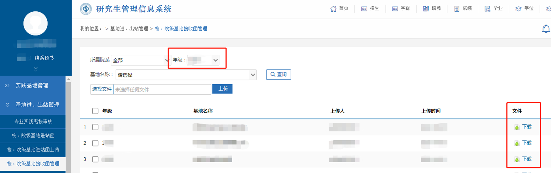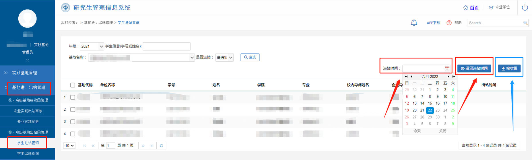 实践基地管理员可在研究生系统中【基地进、出站管理】-【学生进站查询】界面为进站的学生设置进站时间,随后可统一为学生下载、打印接收函。