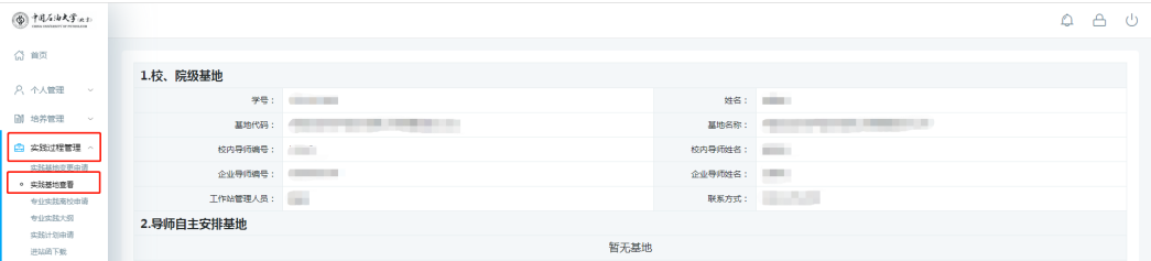 在【实践过程管理】—【实践基地查看】模块,查看基地、企业导师、工作站管理人员等账号信息。