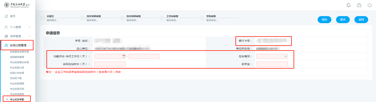 每月月初,学生在系统中【实践过程管理】—【专业实践考勤】模块中填写填写当月在站情况与在站时长,经校外导师、校内导师、工作站与所在学院主管研究生教学院长审核。