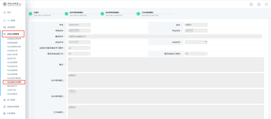 学生确定基地信息,与校企导师确认具备进站条件后,在【实践过程管理】—【专业实践离校申请】填写提交,由学校导师、所在学院主管研究生教学秘书审核;