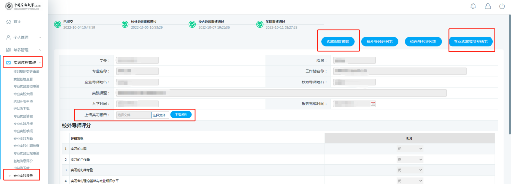学生可在系统【实践过程管理】—【专业实践报告】模块中下载模板,完成实习报告并在系统中上传附件,由校外导师→校内导师→学院审核;审核通过后方可参加专业实践答辩,答辩前应提前下载专业实践答辩考核表,用于填写专家意见。