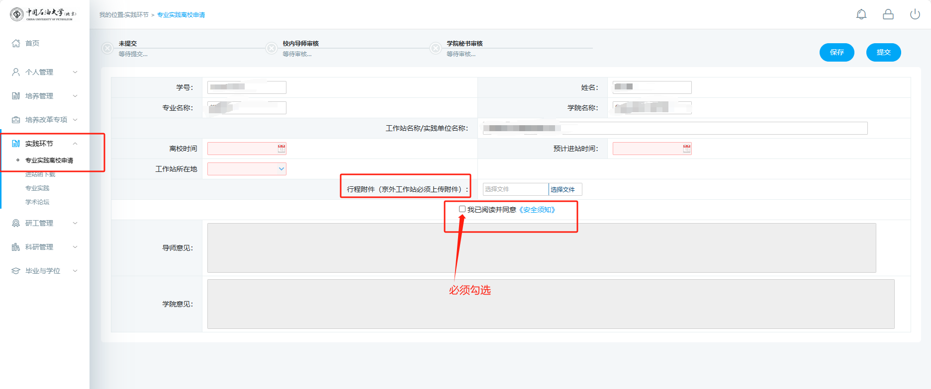 注:校院级基地、导师自主安排与学生自行联系在离校进站前均需提交离校申请。