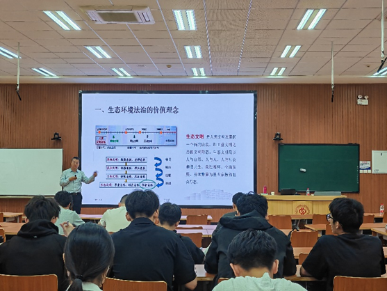 2025年5月8日,中国政法大学民商经济法学院副院长、生态与资源法治研究中心主任、中国环境科学学会环境法学分会主任委员、北京市生态法治研究会副会长于文轩教授受邀前来我校,在五教101为国卓院24级专项生主讲“生态环境法治的理念与基本原则”。