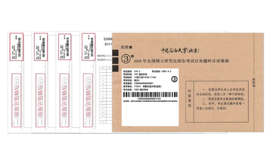 确认信息无误后,将条形码按编号顺序粘贴到对应的自命题答题纸的条形码粘贴区域,将第一、二、三、四张条形码,分别对应粘贴在第1、2、3、4张答题纸上。